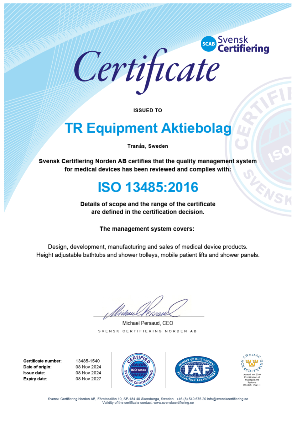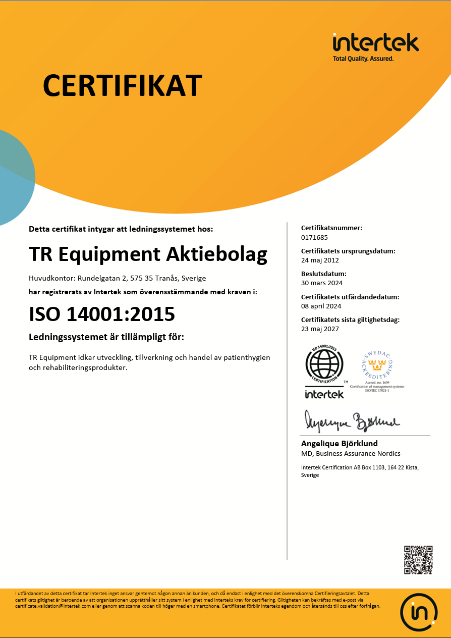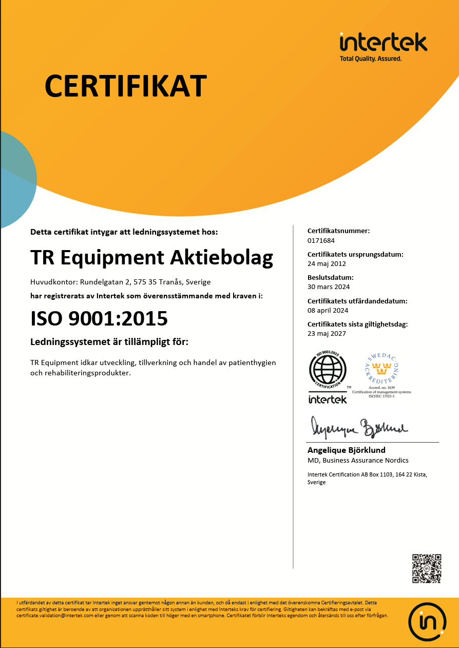Kvalitetscertifikat Kvalitetscertifikat ISO 14001 2015 Certificate TR Equipment (PDF) ISO 9001 2015 Certificate TR Equipment AB (PDF) ISO 13485 Certificate TR Equipment AB